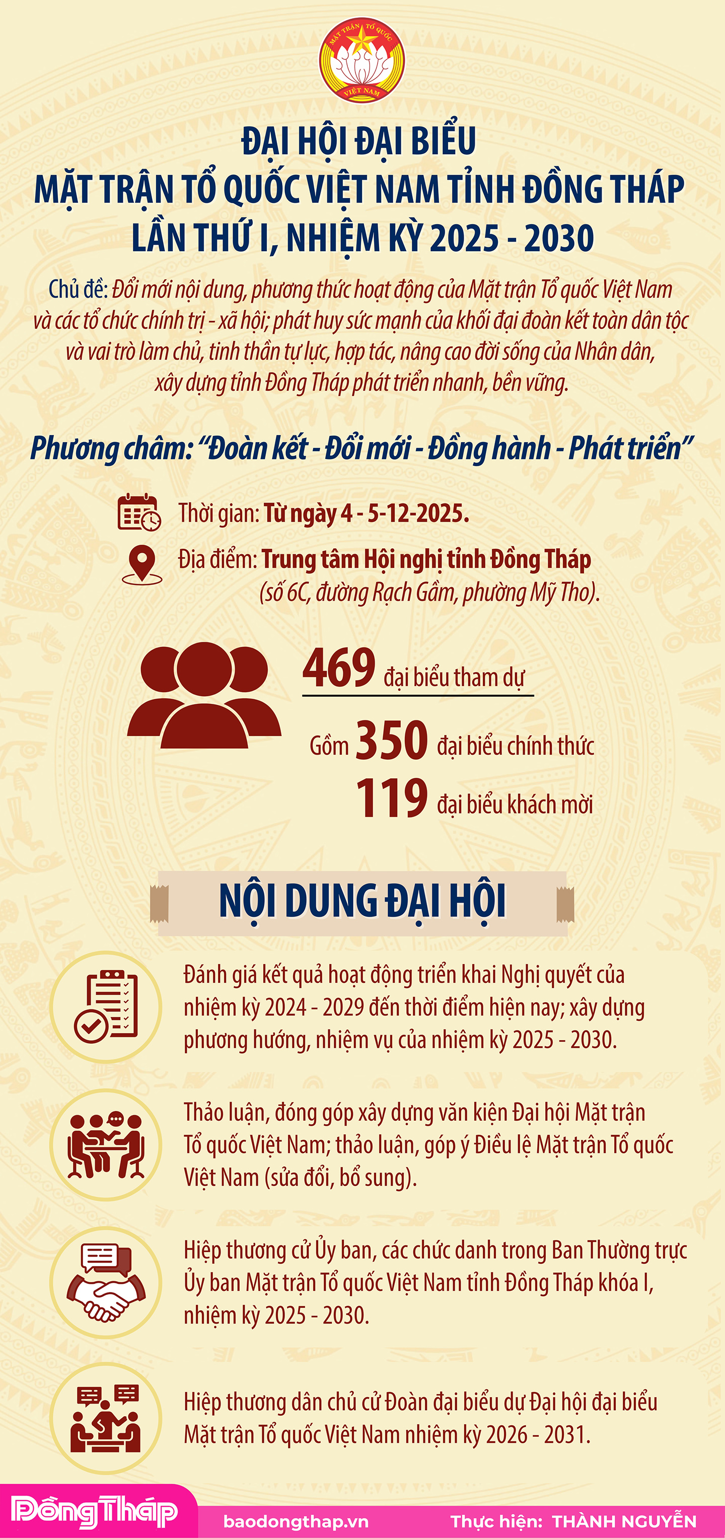 [Infograhic] Đại hội đại biểu Mặt trận Tổ quốc Việt Nam tỉnh Đồng Tháp lần thứ I, nhiệm kỳ 2025 - 2030