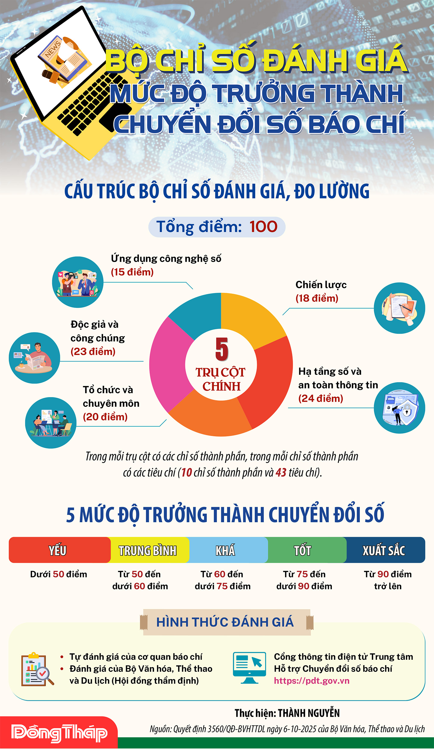 (ĐTO) Ngày 6-10-2025, Bộ Văn hóa, Thể thao và Du lịch Quyết định ban hành Bộ Chỉ số đánh giá, đo lường mức độ trưởng thành chuyển đổi số báo chí.