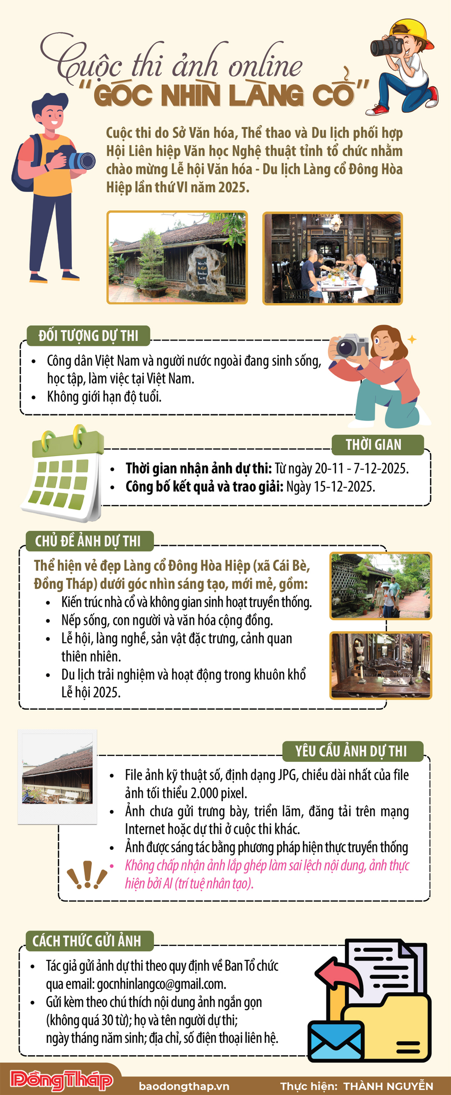 (ĐTO) Cuộc thi do Sở Văn hóa, Thể thao và Du lịch phối hợp Hội Liên hiệp Văn học Nghệ thuật tỉnh Đồng Tháp tổ chức nhằm chào mừng Lễ hội Văn hóa - Du lịch Làng cổ Đông Hòa Hiệp lần thứ VI năm 2025.