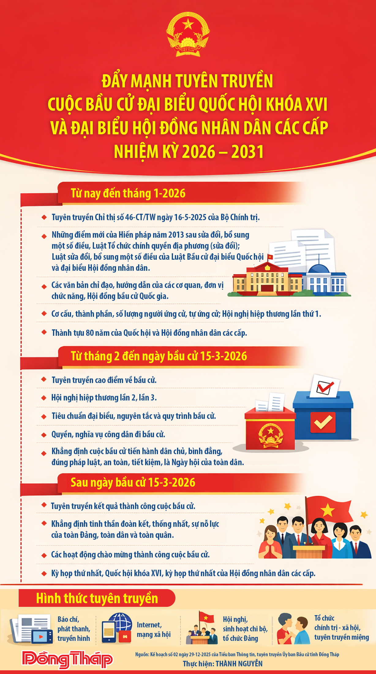 [Infographic] Đẩy mạnh tuyên truyền cuộc bầu cử đại biểu Quốc hội khóa XVI và đại biểu Hội đồng nhân dân các cấp nhiệm kỳ 2026 - 2031Thứ Tư, 07/01/2026, 14:48 (GMT+7) Từ khóa: Đẩy mạnh tuyên truyềncuộc bầu cử đại biểu Quốc hội khóa XVIđại biểu Hội đồng nhân dân các cấp nhiệm kỳ 2026 - 2031 Bình luận 🔄 Gửi