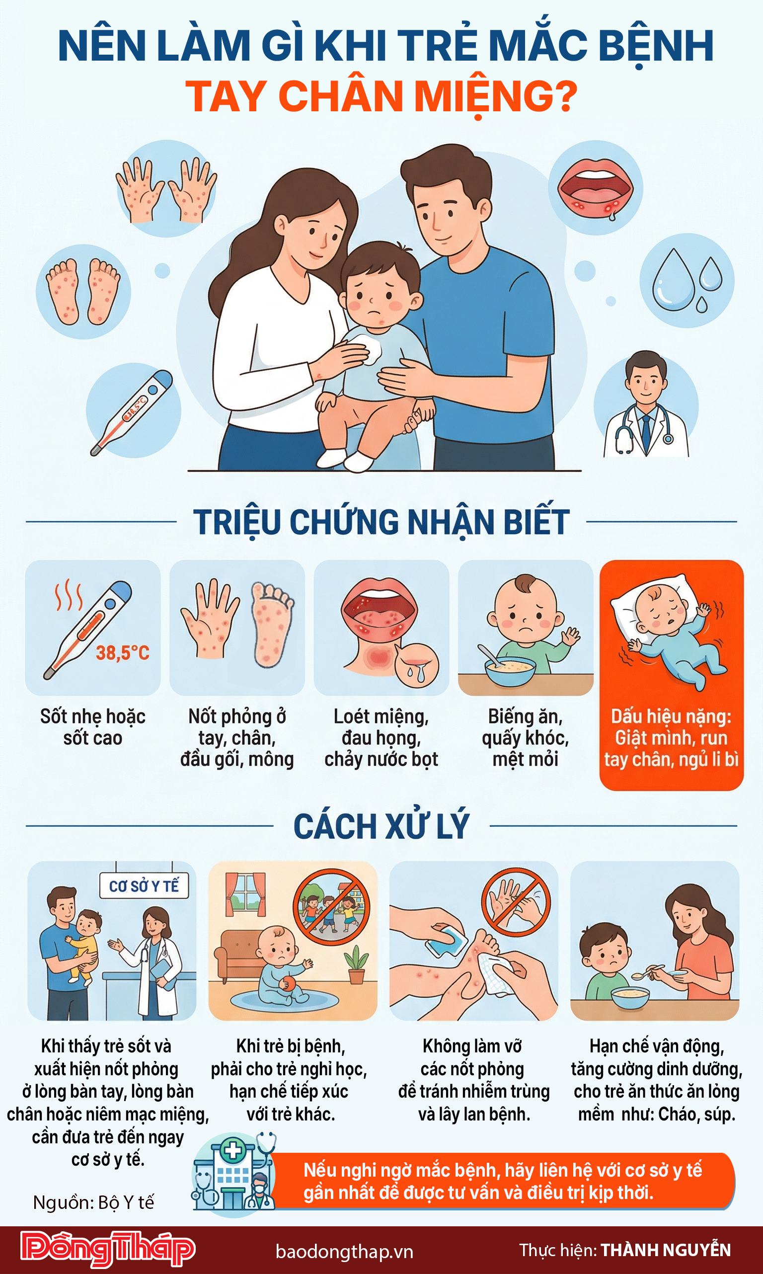 [Infographic] Nên làm gì khi trẻ mắc bệnh tay chân miệngThứ Sáu, 03/04/2026, 14:55 (GMT+7)Theo dõi Báo Đồng Tháp trên Từ khóa: bệnh tay chân miệngtrẻ bị sốtnốt phỏng ở trẻlòng bàn tayniêm mạc miệng Bình luận 🔄 Gửi