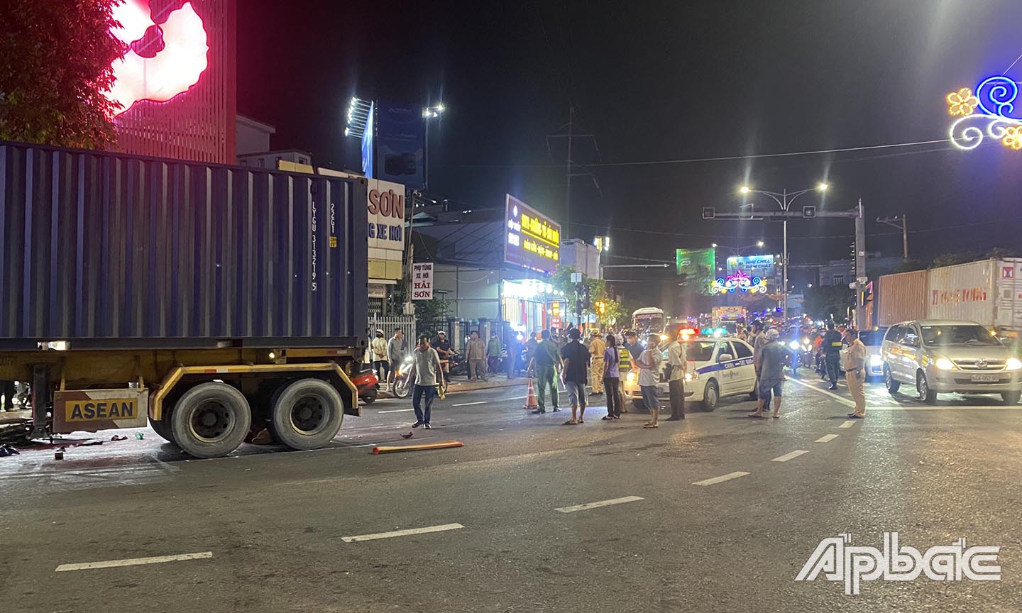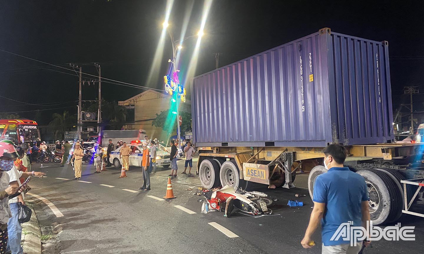 (ABO) Tối 19-7, Công an tỉnh Tiền Giang khẩn trương điều tra làm rõ nguyên nhân của vụ tai nạn giao thông giữa xe container và xe máy, làm 1 phụ nữ tử vong tại chỗ.