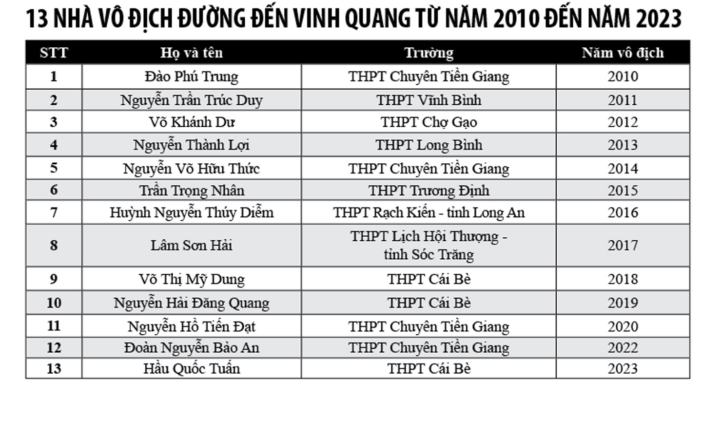 | 4 THÍ SINH THAM DỰ VÒNG CHUNG KẾT NĂM THỨ 14 - CHƯƠNG TRÌNH “ĐƯỜNG ĐẾN VINH QUANG” NĂM HỌC 2023 - 2024 Hồ Thanh Vũ, học sinh Trường THPT Cái Bè, tỉnh Tiền Giang, hạng Nhất quý I, với 335 điểm. Hồ Vĩ Quốc, học sinh Trường THPT Chu Văn An, tỉnh An Giang, hạng Nhất quý II, với 340 điểm. Phan Nguyễn Hoàng Khang, học sinh Trường THPT Cái Bè, tỉnh Tiền Giang, hạng Nhất quý III, với 255 điểm. Nguyễn Hoàng Đăng Khoa, học sinh Trường THPT Chuyên Tiền Giang, hạng Nhì quý I, với 310 điểm. |