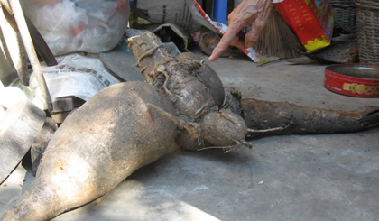 Anh Phúc cho biết, phía sau nhà trước đây là 1 cái đìa, anh thuê nhân công lấy đất ruộng san lấp. Do dây khoai từ trồng sát bên cây bình bát, có hình dạng nhiều nhánh nên trong quá trình đào, một số khúc bị đứt. Sau khi đào lên, anh Phúc ghép các khúc khoai từ lại đem cân mới biết củ khoai nặng đến 63 kg; còn củ khoai mì 28 kg.