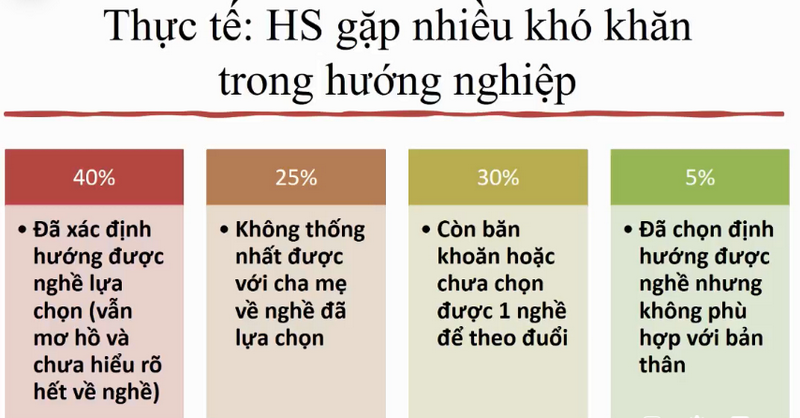 Kết quả khảo sát 1.400 học sinh năm 2020 cho thấy, có 40% học sinh đã xác định hướng nghề lựa chọn nhưng vẫn mơ hồ và chưa hiểu rõ hết về nghề; 25% học sinh không thống nhất được với cha mẹ về nghề đã lựa chọn; 30% học sinh còn băn khoăn hoặc chưa chọn được 1 nghề để theo đuổi; 5% học sinh đã chọn định hướng được nghề nhưng không phù hợp với bản thân.