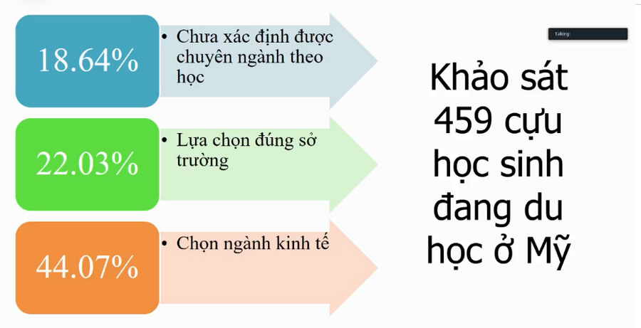 Cũng trong năm 2020, nhóm của PGS Trần Thành Nam khảo sát trực tuyến 459 cựu học sinh đang du học ở Mỹ. Kết quả, 18,64% chưa xác định được chuyên ngành theo học; 22,03% lựa chọn đúng sở trường; 44,07% chọn ngành kinh tế.