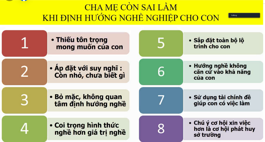 Từ thực tế, PGS Trần Thành Nam nhận thấy, cha mẹ có 8 sai lầm khi định hướng nghề nghiệp cho con như: thiếu tôn trọng mong muốn của con; áp đặt với suy nghĩ “còn nhỏ, chưa biết gì”; coi trọng hình thức nghề hơn giá trị nghề; bỏ mặc, không quan tâm định hướng nghề; sắp đặt toàn bộ lộ trình cho con; hướng nghề không căn cứ vào khả năng của con; sử dụng tài chính để giúp con có việc làm; chú ý cơ hội xin việc hơn là cơ hội phát huy sở trường.