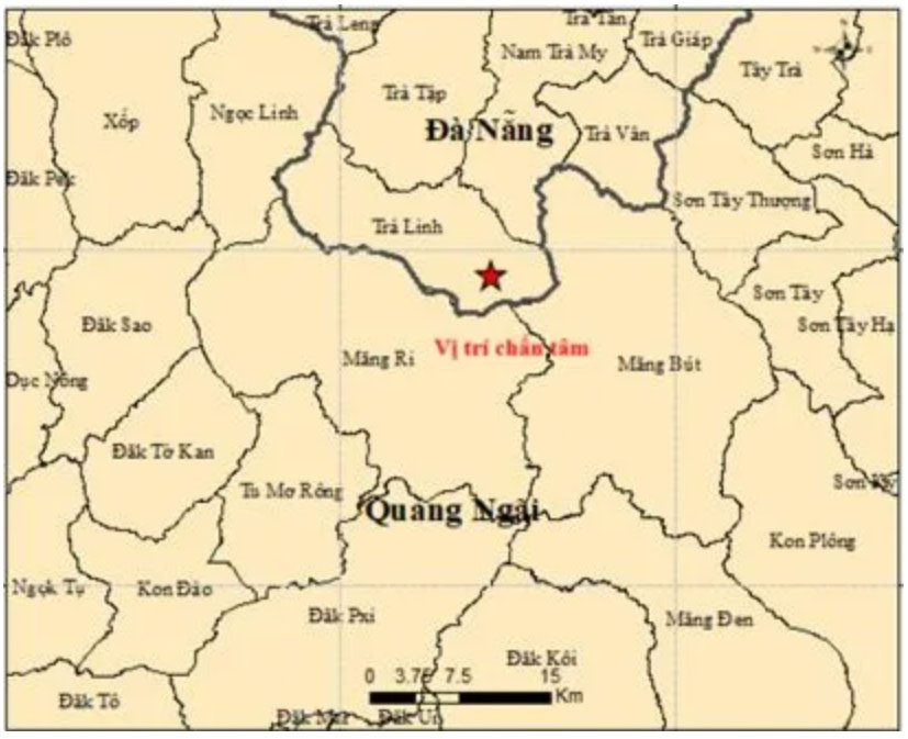 Cụ thể, Trung tâm Báo tin động đất và Cảnh báo sóng thần (Viện Các Khoa học trái đất) thông tin, trận thứ nhất xảy ra lúc 5 giờ 16 phút 56 giây, có độ lớn 3.0, tại tọa độ 14,991 độ vĩ Bắc – 108,120 độ kinh Đông, thuộc xã Trà Linh (TP Đà Nẵng), độ sâu chấn tiêu khoảng 8,1km.