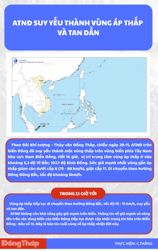 (ĐTO) Áp thấp nhiệt đới trên Biển Đông suy yếu thành vùng áp thấp và tan dần.