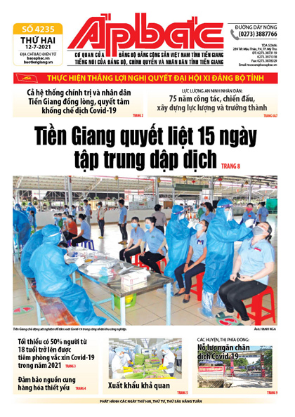 UBND tỉnh Tiền Giang đã quyết định thực hiện cách ly xã hội theo Chỉ thị 16 của Thủ tướng Chính phủ trong vòng 15 ngày, kể từ 00 giờ ngày 12-7. Trong thời gian 15 ngày tới, Tiền Giang sẽ phải dồn lực tối đa với các giải pháp hiệu quả với quyết tâm đẩy lùi dịch Covid-19 trên địa bàn. Tiền Giang quyết liệt 15 ngày tập trung dập dịch (xem trang 8).