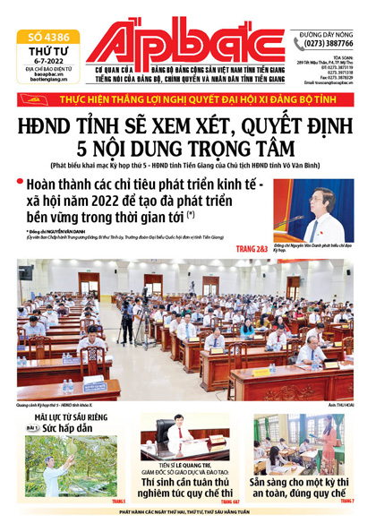 Sáng 5-7, HĐND tỉnh Tiền Giang khóa X khai mạc Kỳ họp thứ 5. Buổi sáng, HĐND tỉnh báo cáo kết quả hoạt động của Thường trực HĐND tỉnh 6 tháng đầu năm và nhiệm vụ 6 tháng cuối năm 2022, UBND tỉnh báo cáo về tình hình kinh tế - xã hội tỉnh Tiền Giang 6 tháng đầu năm và nhiệm vụ 6 tháng cuối năm 2022… Chiều cùng ngày, lãnh đạo các sở, ngành tỉnh tiếp tục báo cáo kết quả thực hiện nhiệm vụ 6 tháng đầu năm và nhiệm vụ 6 tháng cuối năm 2022; trình các Tờ trình kèm theo dự thảo nghị quyết… Ngày làm việc đầu tiên Kỳ họp thứ 5 - HĐND tỉnh khóa X (xem trang 2, 3).