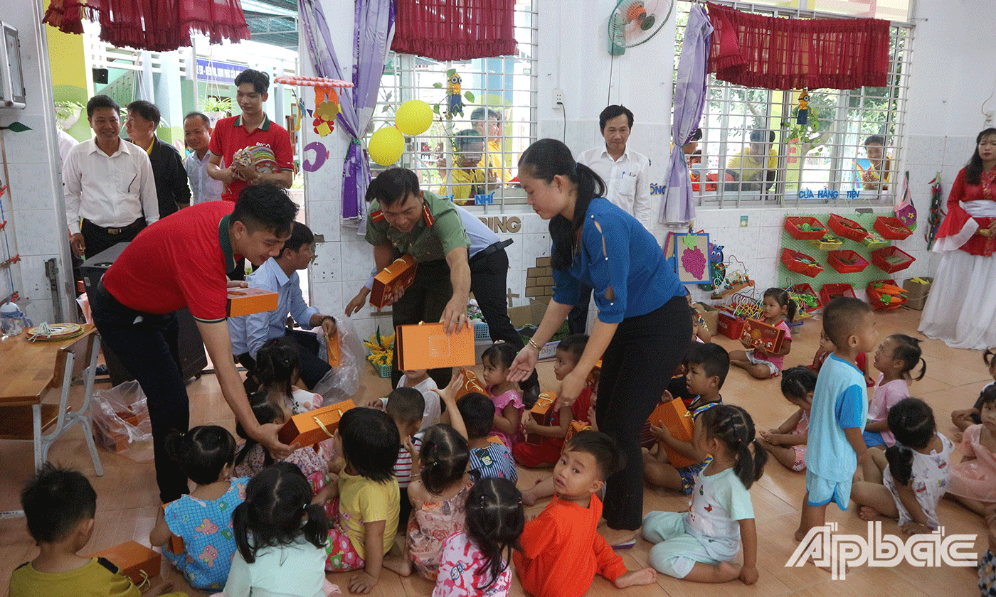 | Phó Tổng Biên tập Báo Ấp Bắc Nguyễn Trọng Tấn trao quà trung thu cho trẻ em xã Phú Đông. |