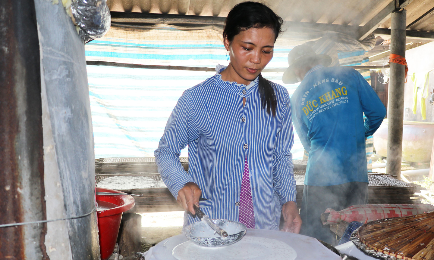 Lò bánh của gia đình chị Nguyễn Thị Kim Yến ở khu vực ấp Hậu Thuận, đang hối hả lao động khẩn trương. Chị Yến cho biết, nghề tráng bánh này cha truyền con nối, chính nghề này đã nuôi sống cả gia đình trong suốt nhiều năm qua. Ngoài hiên bếp, củi lửa đã sẵn sàng, hơi nóng trong lò cũng đã bốc lên, chị Yến thoăn thoắt đổ bột vào khuôn; chỉ trong lát, chiếc bánh đầu tiên cũng đã ra lò trong làng khói thơm ngát mùi bột nếp hòa lẫn mùi thơm nước cốt dừa. Chưa đầy 5 phút, vỉ bánh đầu tiên đã hoàn tất, chị Yến thoăn thoắt đem vỉ ra sân phơi rồi vào làm tiếp mẻ bánh tiếp theo.