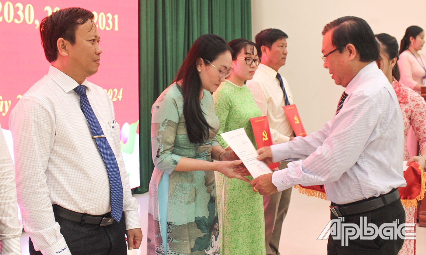 | Đồng chí Nguyễn Văn Nhã, Ủy viên Ban Thường vụ, Trưởng Ban Tổ chức Tỉnh ủy trao Giấy chứng nhận cho các học viên. |