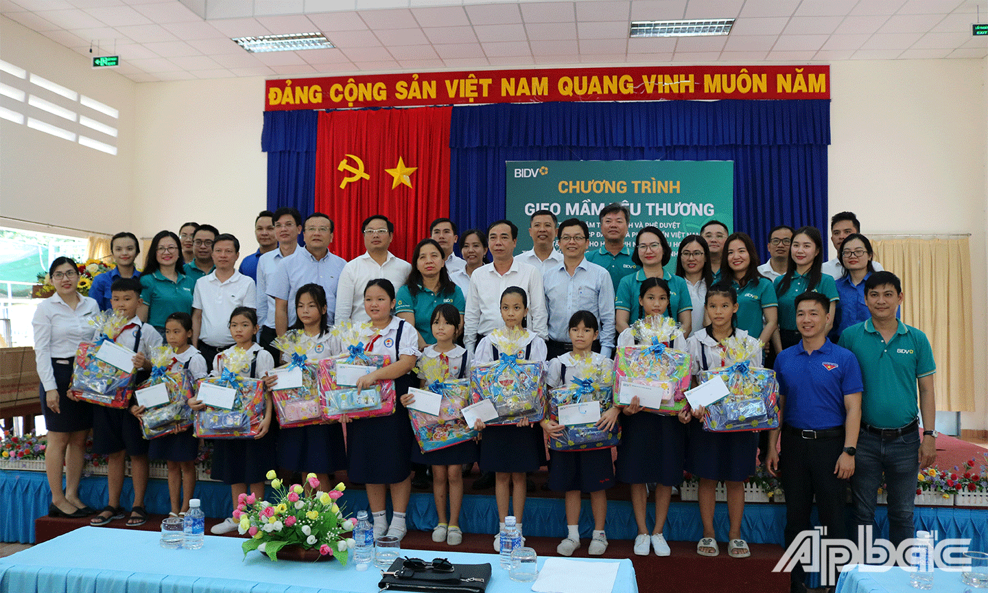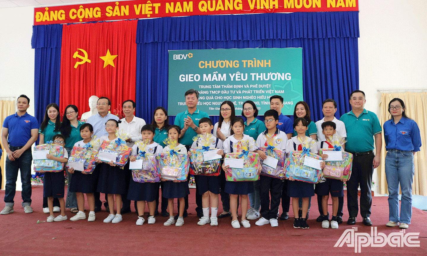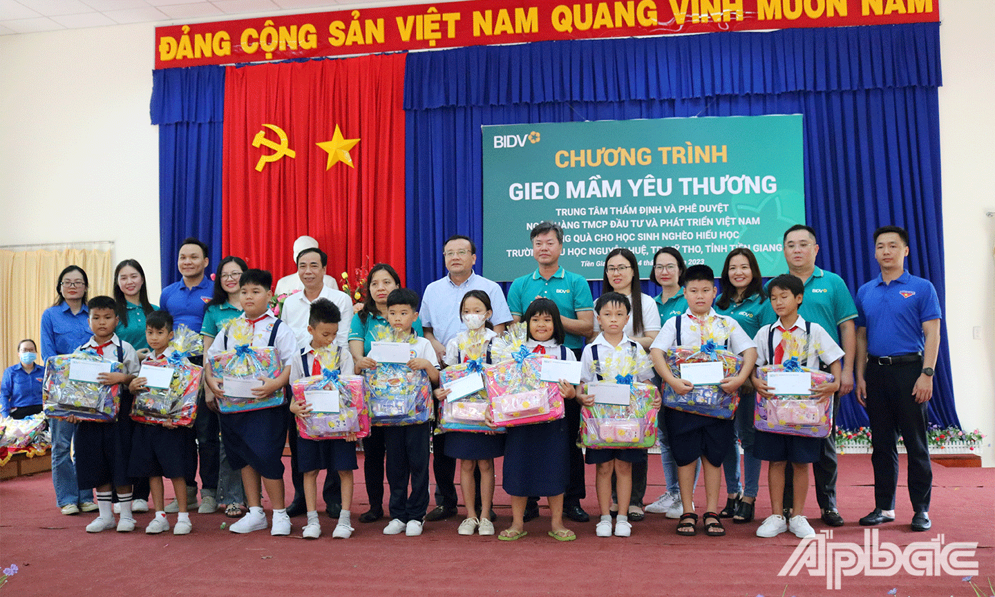 (ABO) Ngày 14-6, Công đoàn cơ sở và Chi đoàn cơ sở Trung tâm Thẩm định và Phê duyệt Ngân hàng Thương mại cổ phần Đầu tư và Phát triển Việt Nam (BIDV) tổ chức Chương trình “Gieo mầm yêu thương” trao quà cho học sinh nghèo, hiếu học của Trường Tiểu học Nguyễn Huệ (TP. Mỹ Tho, tỉnh Tiền Giang).