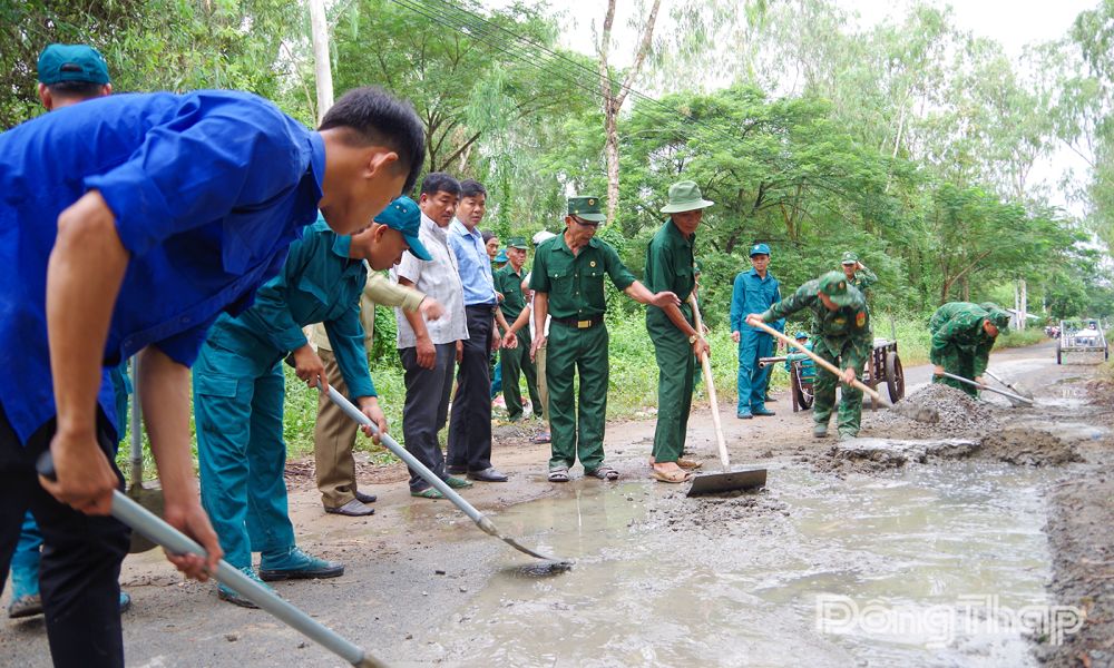 (ĐTO) Thực hiện Chương trình “Ngày vì cộng đồng”, từ ngày 6 đến 9-12, Đồn Biên phòng Cửa khẩu Quốc tế Dinh Bà huy động hàng chục lượt cán bộ, chiến sĩ phối hợp với các ngành, đoàn thể xã Tân Hộ Cơ và thành viên Tổ tự quản đường biên, mốc quốc giới Dinh Bà (ấp Dinh Bà, xã Tân Hộ Cơ, tỉnh Đồng Tháp) ra quân thực hiện nhiều phần việc thiết thực. Lực lượng đã vận động mạnh thường quân và người dân hỗ trợ 25 bao xi măng, 10 m³ cát, đá để dặm vá 400 m đường tuần tra biên giới bị hư hỏng, với tổng kinh phí trên 8 triệu đồng; đồng thời, chặt mé cành cây, phát quang cỏ, mở rộng tầm nhìn gần 1,5 km tuyến đường tuần tra.