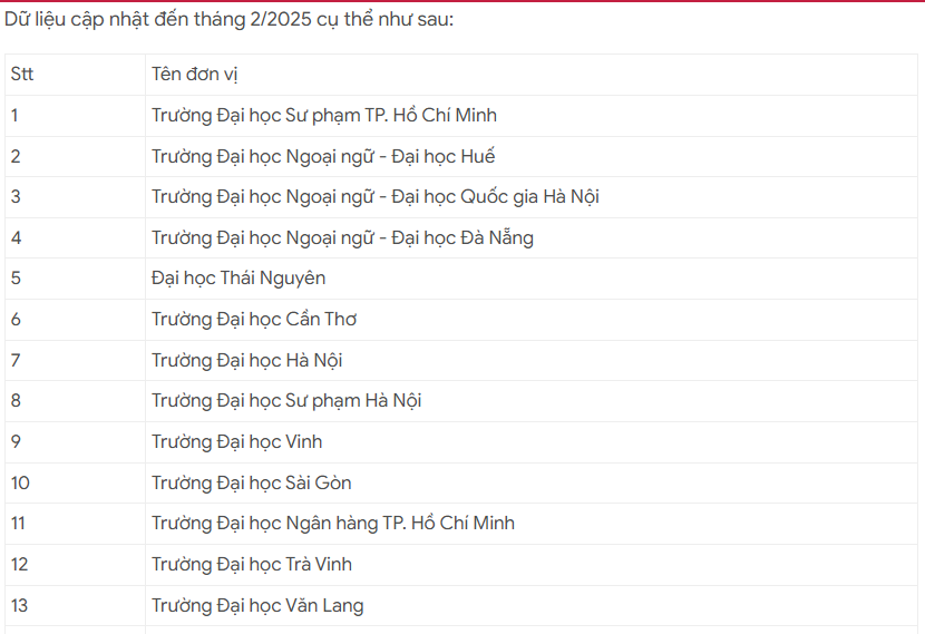 Bộ GD&ĐT công bố danh sách các đơn vị tổ chức thi đánh giá năng lực tiếng Anh theo Khung năng lực ngoại ngữ 6 bậc dùng cho Việt Nam.