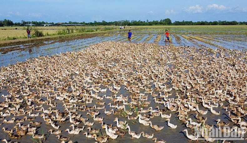 | Nghề nuôi vịt đẻ trứng chạy đồng rất cơ cực nhưng rất phổ biến ở miền Tây Nam Bộ. |