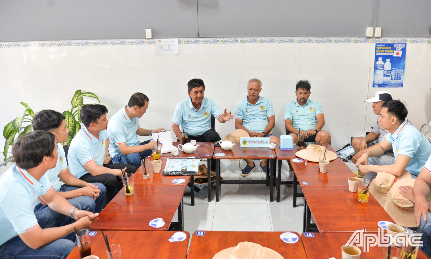 | Huấn luyện viên Issawa Singthong giao lưu cùng cổ động viên bóng đá Tiền Giang. |
