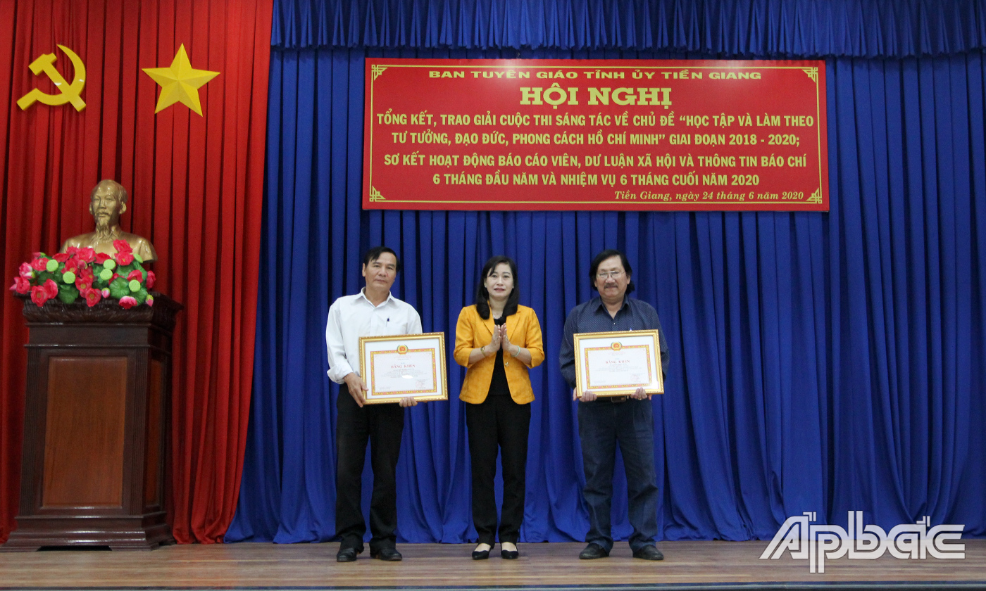 Dịp này, thừa ủy quyền của Ban Tuyên giáo Trung ương, Ban Tuyên giáo Tỉnh ủy trao giải Khuyến khích cho tác giả đơn vị Báo Ấp Bắc đã đoạt giải trong Cuộc thi sáng tác, quảng bá tác phẩm văn học, nghệ thuật, báo chí về chủ đề “Học tập và làm theo tư tưởng, đạo đức, phong cách Hồ Chí Minh” giai đoạn 2018 - 2020. Tỉnh ủy đã tặng Bằng khen cho 72 cá nhân, nhóm tác giả đạt giải thưởng cấp tỉnh Cuộc thi sáng tác, quảng bá tác phẩm văn học, nghệ thuật, báo chí về chủ đề “Học tập và làm theo tư tưởng, đạo đức, phong cách Hồ Chí Minh” giai đoạn 2018 - 2020.