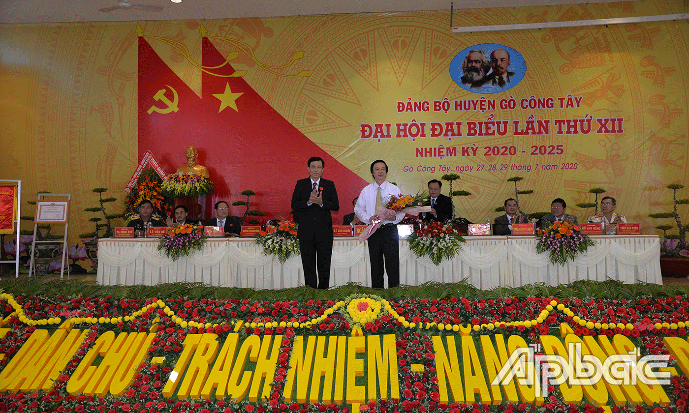 | Lãnh đạo huyện Gò Công Tây tặng hoa các đồng chí lãnh đạo tỉnh tại Đại hội. |