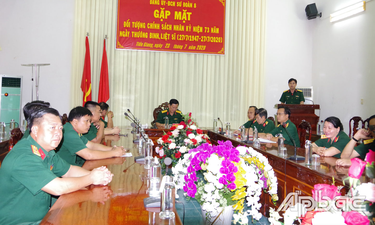 (ABO) Sáng 23-7, Đảng ủy - Ban Chỉ huy Sư đoàn 8 tổ chức buổi gặp mặt đối tượng chính sách là con thương binh, liệt sĩ, Bà mẹ Việt Nam Anh hùng đang công tác tại Sư đoàn 8 nhân kỷ niệm 73 năm Ngày Thương binh - Liệt sĩ (27-7-1947 - 27-7-2020). Đại tá Nguyễn Văn Tuấn, Phó Chính ủy Sư đoàn 8 chủ trì và trao quà cho các đối tượng.
