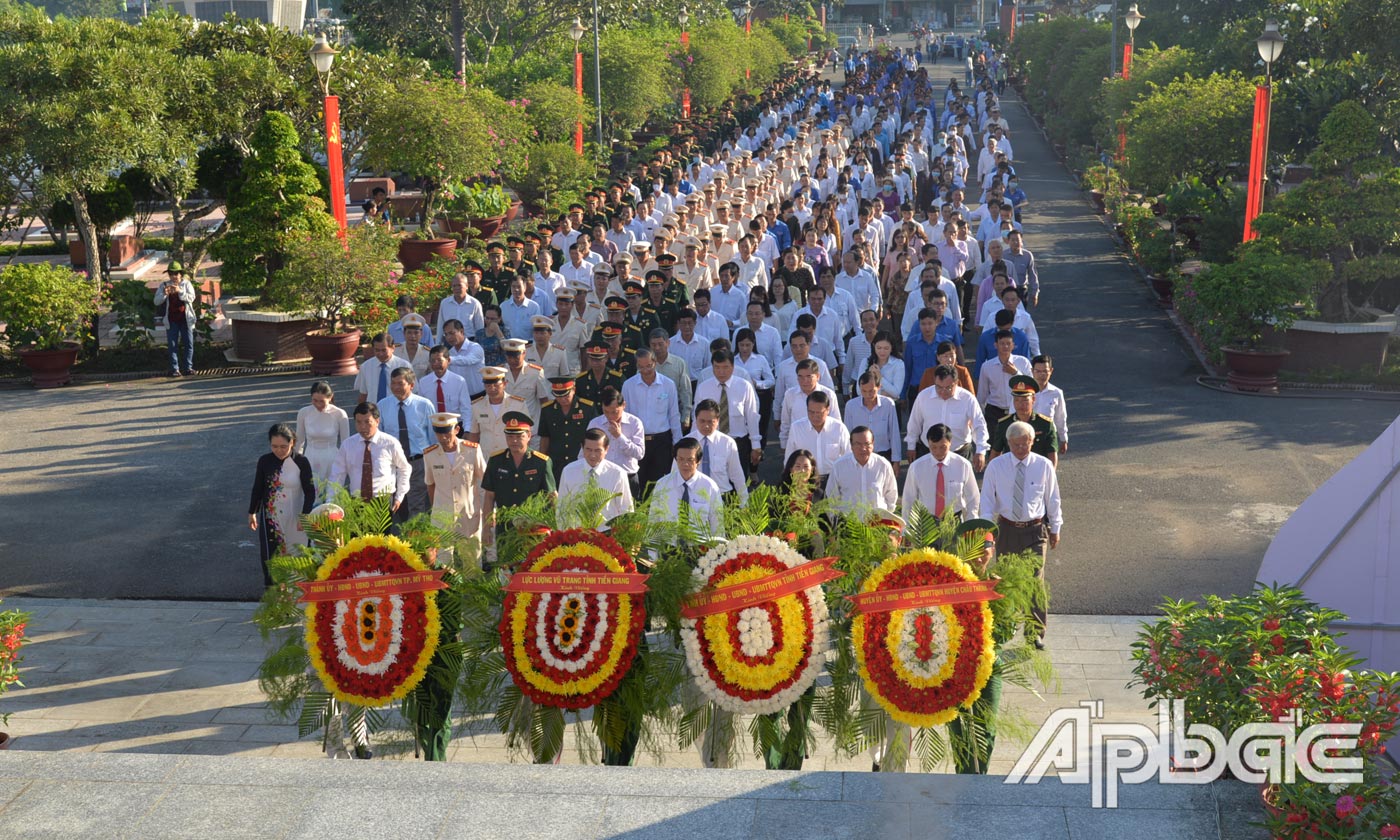 | Đoàn lãnh đạo tỉnh Tiền Giang đặt tràng hoa viếng Nghĩa trang Liệt sĩ tỉnh. |