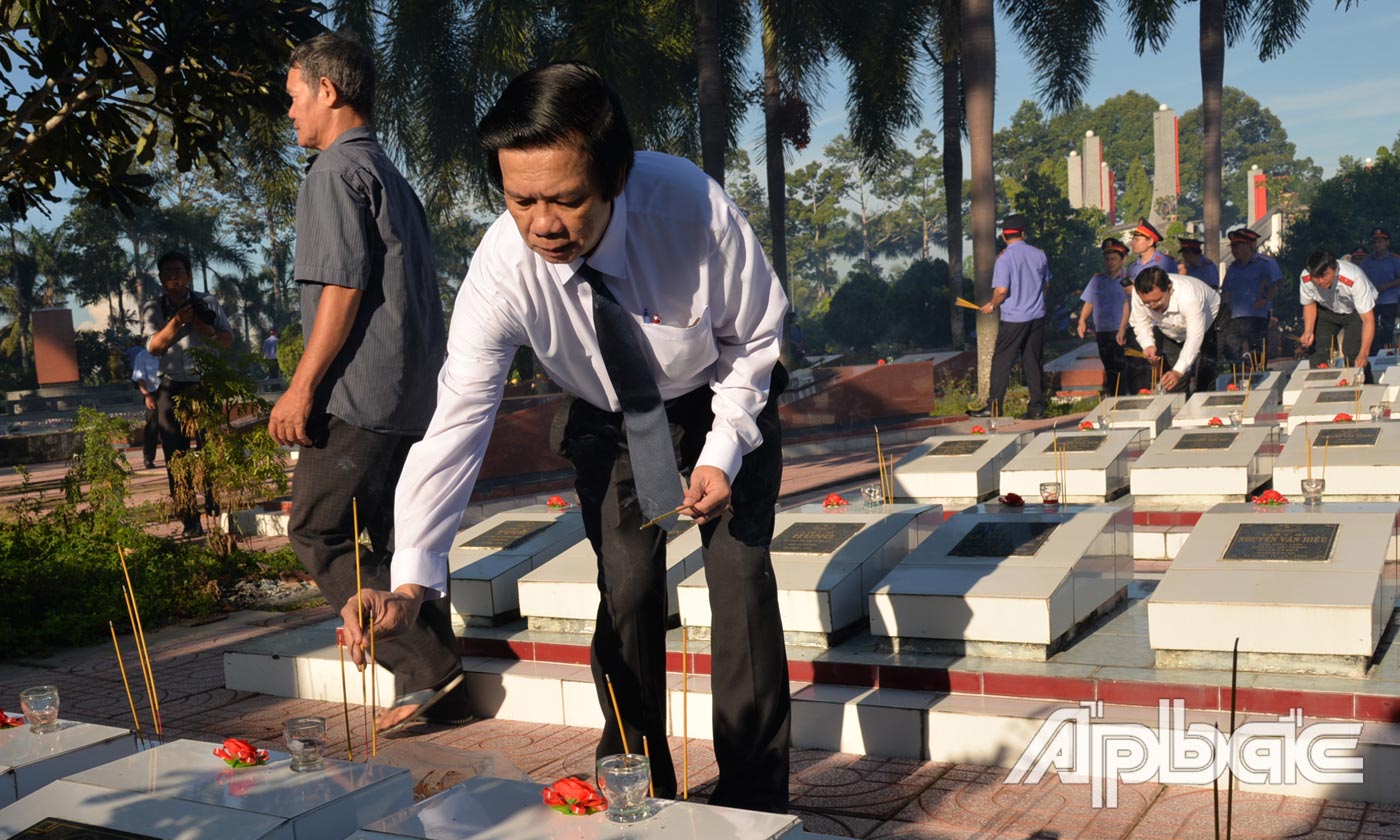 | Đồng chí Nguyễn Văn Danh thắp hương tại các mộ liệt sĩ. |