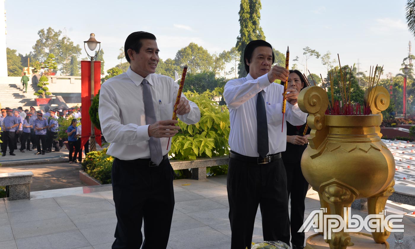 | Lãnh đạo tỉnh Tiền Giang thắp hương tại Bia ghi danh các liệt sĩ vô danh. |