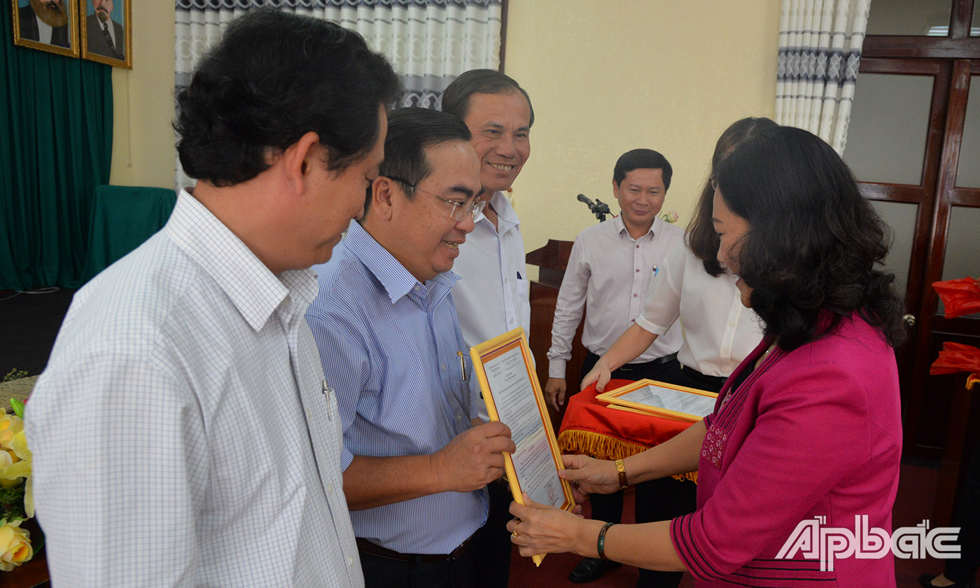 | Trao Quyết định và tặng hoa chúc mừng các đồng chí vừa được bổ nhiệm giữ chức vụ Chánh Văn phòng và Phó Chánh Văn phòng Đoàn ĐBQH và HĐND tỉnh Tiền Giang. |