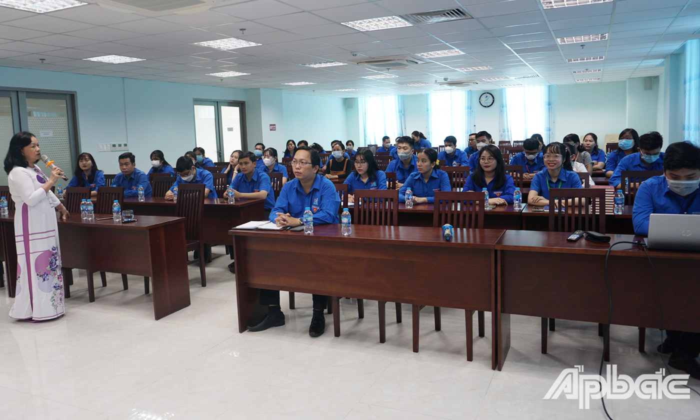 Tại hội nghị, đồng chí Bùi Thị Mai, Trưởng Ban Tôn giáo Sở Nội vụ Tiền Giang báo cáo chuyên đề công tác hội nhập quốc tế trên lĩnh vực tín ngưỡng, tôn giáo gắn với bảo vệ nền tảng tư tưởng của Đảng, đấu tranh phản bác các quan điểm sai trái, thù địch trên lĩnh vực tín ngưỡng, tôn giáo giai đoạn hiện nay cho cán bộ Đoàn, đoàn viên, thanh niên khối cơ quan và doanh nghiệp tỉnh Tiền Giang.