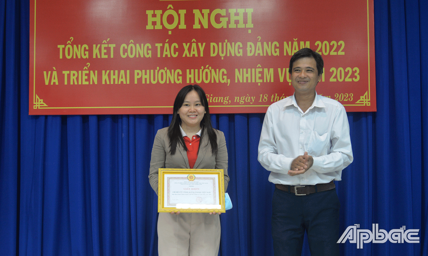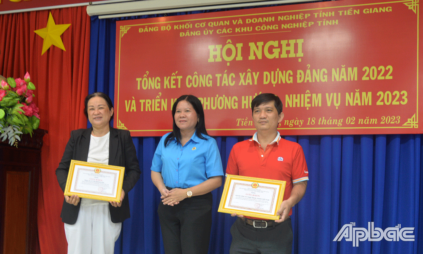 Tại hội nghị, Đảng ủy Các khu công nghiệp tỉnh đã khen thưởng cho các chi bộ, đảng viên hoàn thành xuất sắc nhiệm vụ năm 2022; tập thể, cá nhân có thành tích trong thực hiện Chỉ thị 05 và thực hiện tốt Quy chế dân chủ cơ sở.