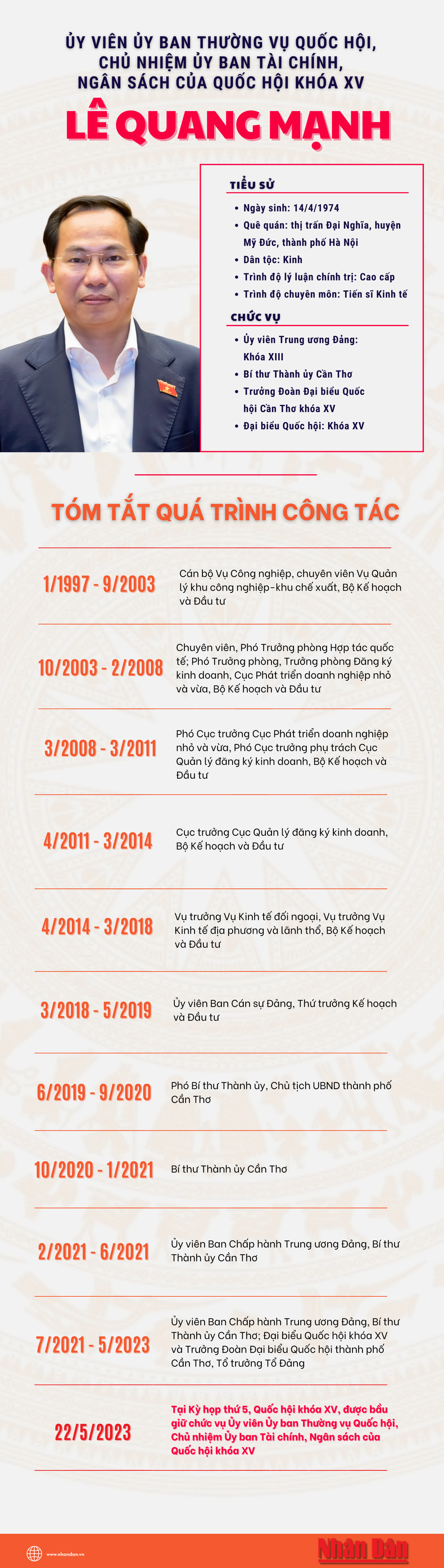 Ngày 22-5, tại Kỳ họp thứ 5, Quốc hội khóa XV, đồng chí Lê Quang Mạnh, Ủy viên Trung ương Đảng, Bí thư Thành ủy Cần Thơ đã được Quốc hội bầu giữ chức Ủy viên Ủy ban Thường vụ Quốc hội, Chủ nhiệm Ủy ban Tài chính, Ngân sách của Quốc hội.