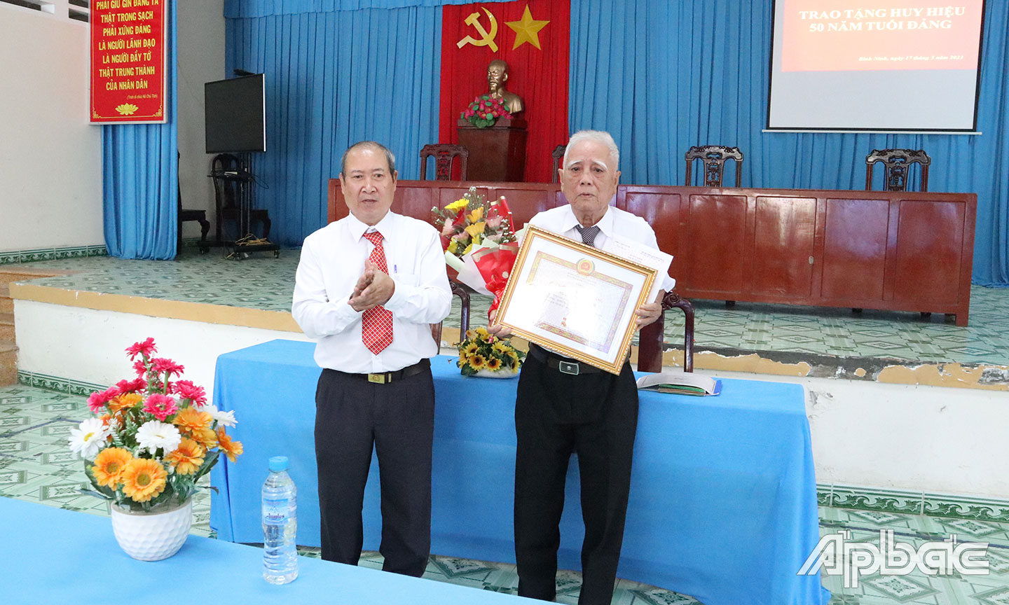 Đồng chí Lê Văn Mỹ chúc mừng và trao Huy hiệu 50 năm tuổi Đảng cho đảng viên Nguyễn Văn Mười. |