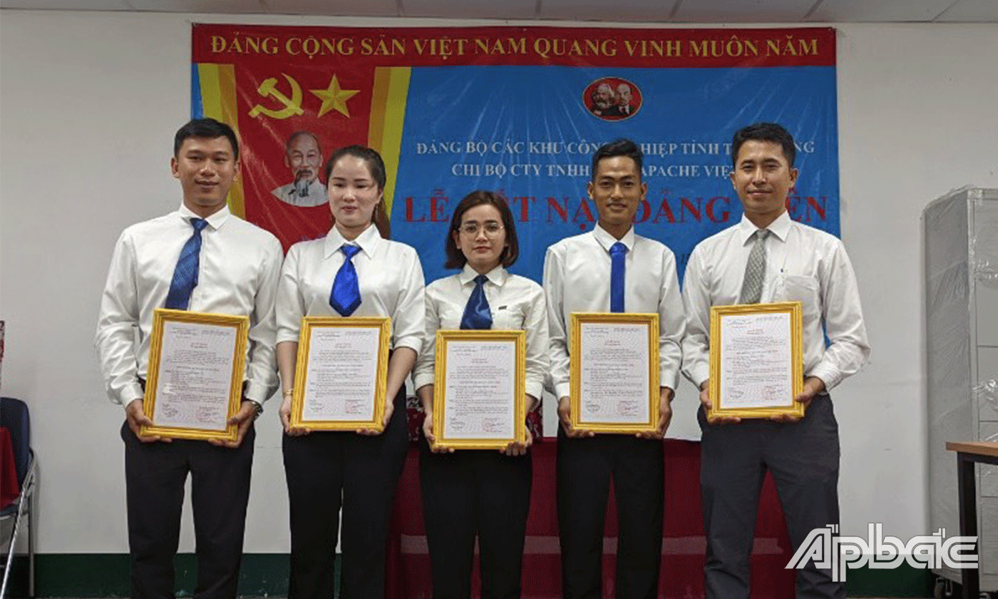 (ABO) Chiều 15-11, Chi bộ Công ty TNHH Giày Apheche Việt Nam (Khu công nghiệp Long Giang, huyện Tân Phước) trực thuộc Đảng bộ Các khu công nghiệp tỉnh Tiền Giang tổ chức Lễ kết nạp đảng cho 5 quần chúng ưu tú. Tham dự có đồng chí Trần Minh Diễn, Bí thư Đảng ủy Các khu công nghiệp tỉnh Tiền Giang.