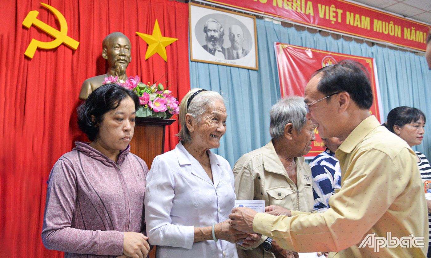 | Đồng chí Trần Kim Trát trao quà của Ban Vận động Quỹ Vì người nghèo tỉnh Tiền Giang cho các hộ nghèo, hộ cận nghèo trên địa bàn khu phố 7. |