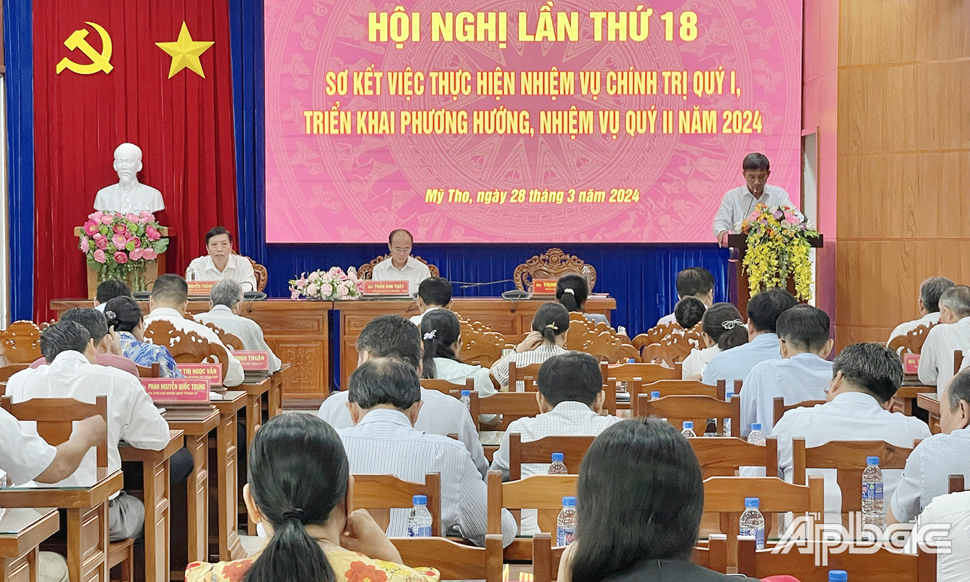 (ABO) Ngày 28-3, Thành ủy Mỹ Tho, tỉnh Tiền Giang tổ chức Hội nghị Ban Chấp hành Đảng bộ thành phố lần thứ 18 (mở rộng) để sơ kết thực hiện nhiệm vụ chính trị trong quý I, triển khai nhiệm vụ quý II-2024.