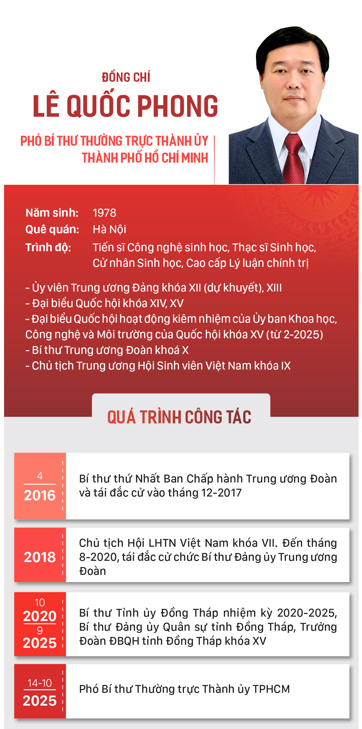 Theo đó, Bộ Chính trị quyết định đồng chí Lê Quốc Phong, Bí thư Tỉnh ủy, Trưởng Đoàn đại biểu Quốc hội tỉnh Đồng Tháp thôi tham gia Ban Chấp hành Đảng bộ, Ban Thường vụ, thôi giữ chức Bí thư Tỉnh ủy tỉnh Đồng Tháp nhiệm kỳ 2025-2030 và các chức danh trong cơ cấu; điều động, phân công, chỉ định tham gia Ban Chấp hành Đảng bộ, Ban Thường vụ, giữ chức Phó Bí thư Thường trực Thành ủy TPHCM nhiệm kỳ 2025-2030.