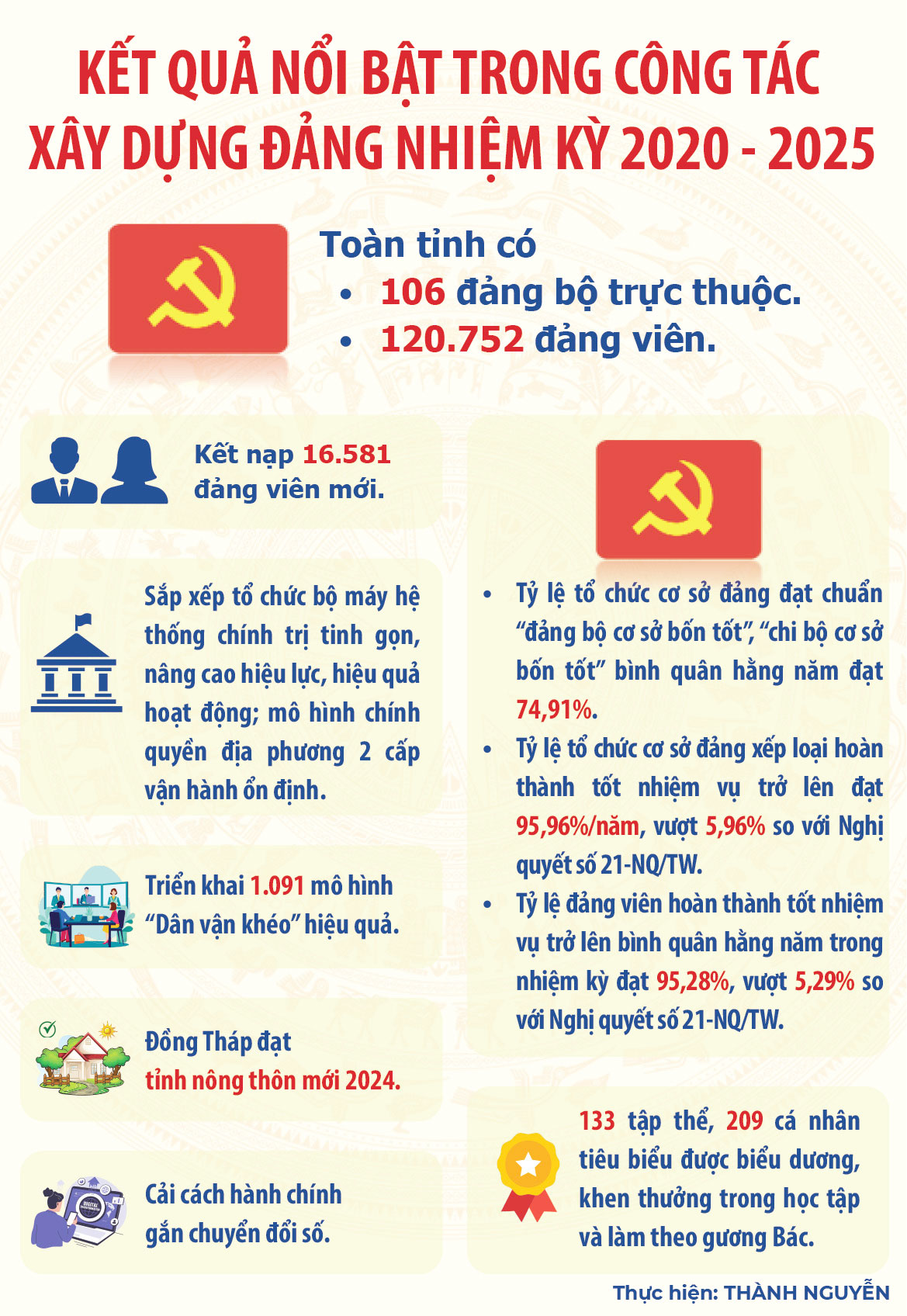 Điểm nhấn quan trọng là việc học tập và làm theo tư tưởng, đạo đức, phong cách Hồ Chí Minh được thực hiện nghiêm túc. Kết quả nổi bật là xuất hiện nhiều mô hình hay, cách làm hiệu quả, tấm gương tiêu biểu, tạo sức lan tỏa mạnh mẽ trong toàn Đảng bộ. Điểm nhấn cụ thể là trong nhiệm kỳ 2020 - 2025, tỉnh Đồng Tháp biểu dương, khen thưởng 133 tập thể, 209 cá nhân tiêu biểu trong học tập và làm theo tư tưởng, đạo đức, phong cách Hồ Chí Minh.