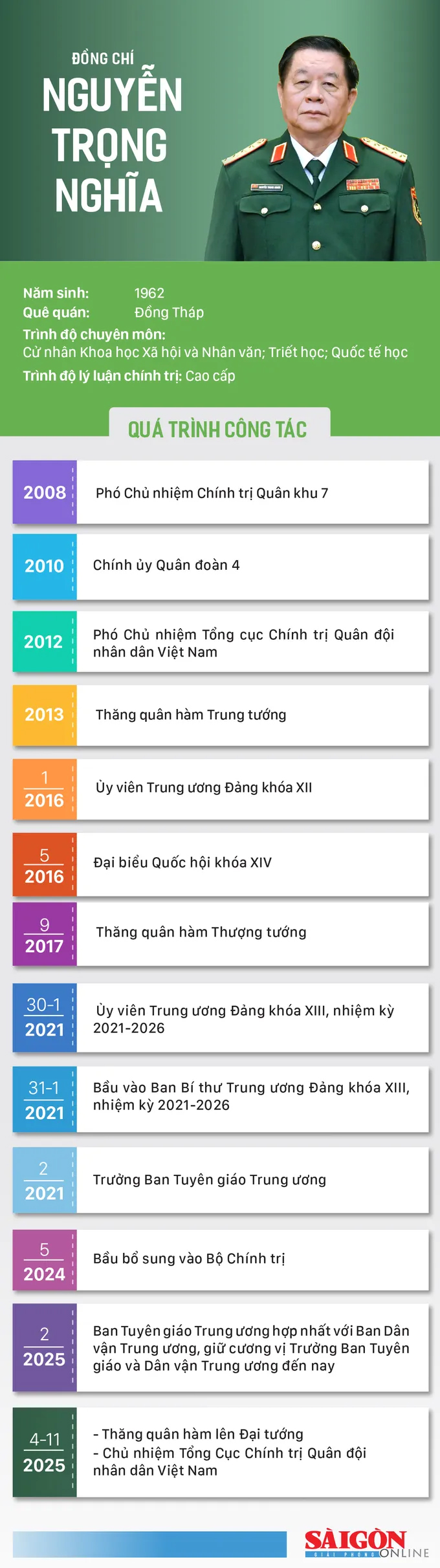 Tại buổi lễ, thừa ủy quyền của Chủ tịch nước, đồng chí Nguyễn Hoàng Anh, Phó Chủ nhiệm Văn phòng Chủ tịch nước, đã công bố Quyết định của Chủ tịch nước bổ nhiệm đồng chí Nguyễn Trọng Nghĩa, Ủy viên Bộ Chính trị, Bí thư Trung ương Đảng, Trưởng Ban Tuyên giáo và Dân vận Trung ương, giữ chức Chủ nhiệm Tổng Cục Chính trị Quân đội nhân dân Việt Nam, đồng thời thăng quân hàm từ Thượng tướng lên Đại tướng.