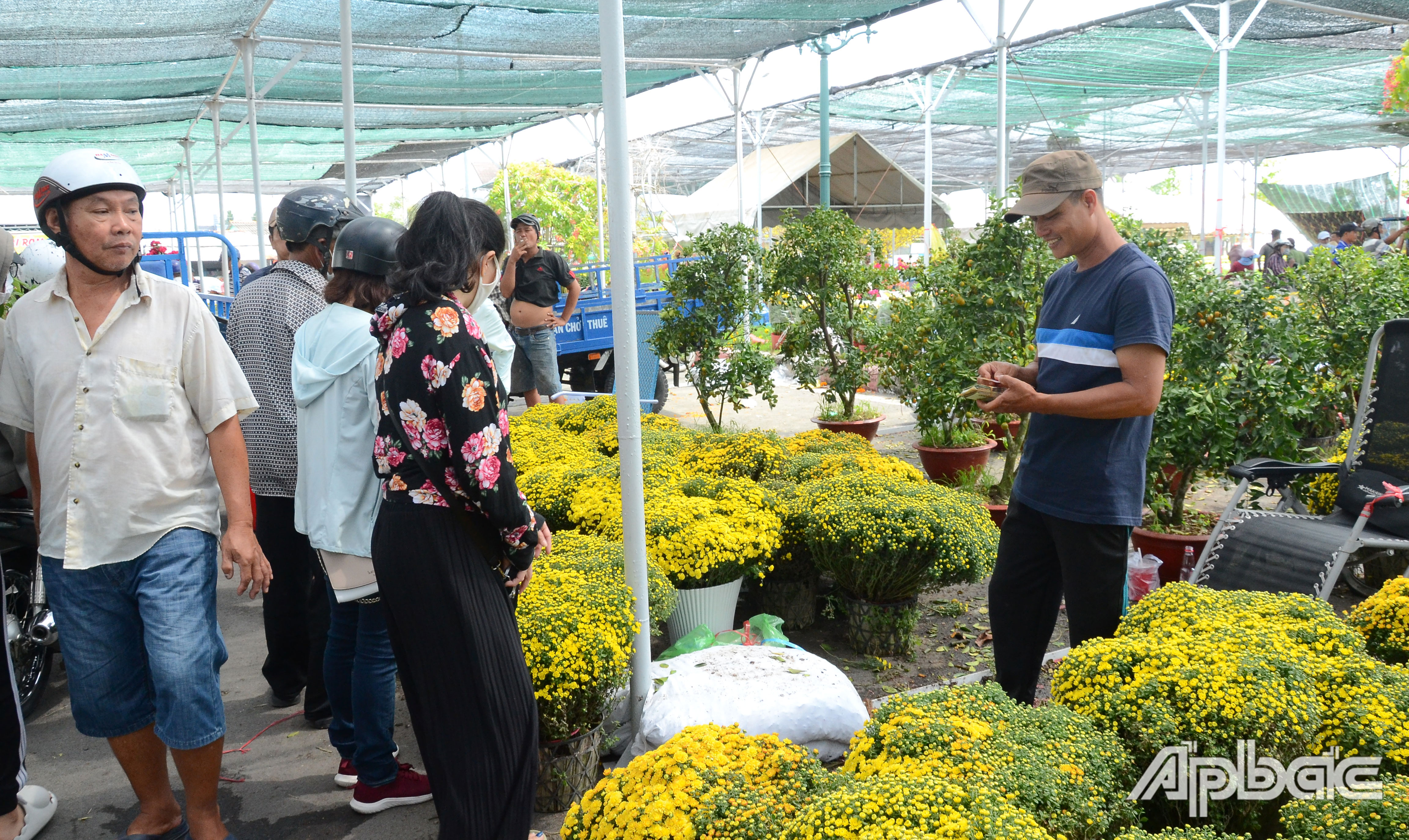 | Sức mua tại Chợ hoa xuân TP. Mỹ Tho tăng vào chiều 30 Tết, nhưng không bằng mọi năm. |