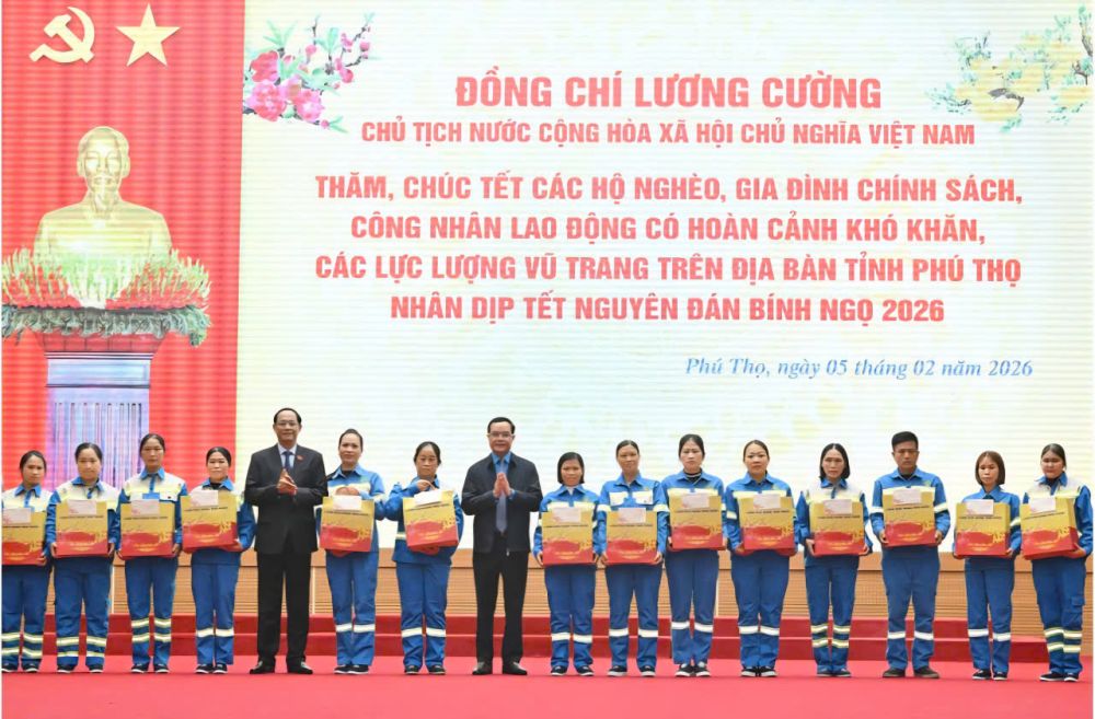 Nhân dịp đầu năm mới 2026 và trước thềm Tết Nguyên đán Bính Ngọ, sáng 5-2, Chủ tịch nước Lương Cường và Đoàn công tác Trung ương đã tới thăm, động viên và chúc Tết Đảng bộ, chính quyền, các hộ nghèo, gia đình chính sách, công nhân lao động có hoàn cảnh khó khăn và cán bộ, chiến sĩ lực lượng vũ trang tỉnh Phú Thọ.