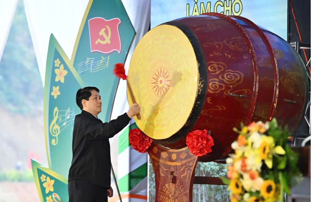 Sau khi đánh trống khai lễ phát động Tết trồng cây, Chủ tịch nước Lương Cường cùng các đại biểu, đại diện các tổ chức chính trị xã hội và đồng bào địa phương tham gia trồng cây tại khu vực thực hiện dự án Công viên văn hóa Lào Cai thuộc phường Cam Đường.