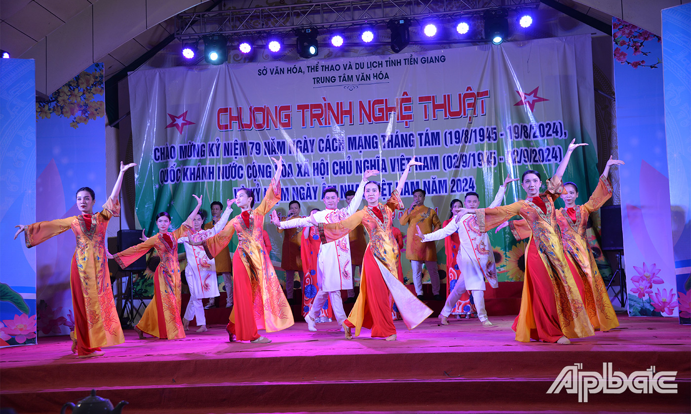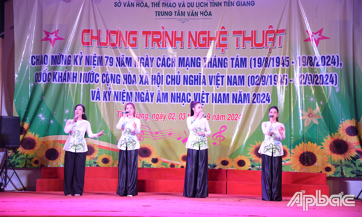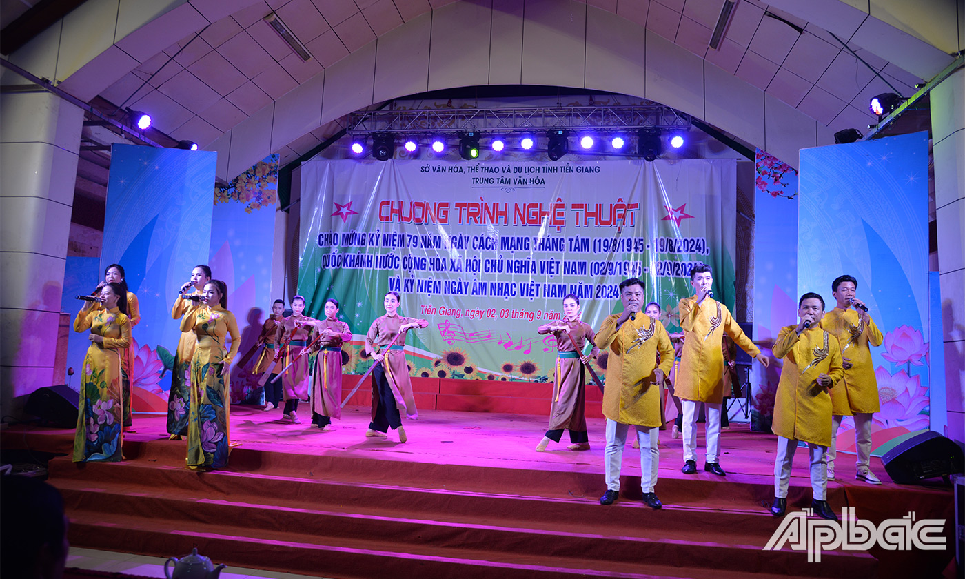 (ABO) Tối 2-9, Trung tâm Văn hóa tỉnh Tiền Giang tổ chức Chương trình nghệ thuật chào mừng kỷ niệm 79 năm Cách mạng Tháng Tám (19-8-1945 - 19-8-2024), Quốc khánh nước Cộng hoà xã hội chủ nghĩa Việt Nam (2-9-1945 - 2-9-2024) và kỷ niệm Ngày Âm nhạc Việt Nam năm 2024.