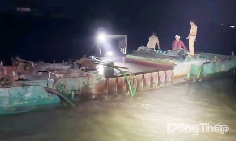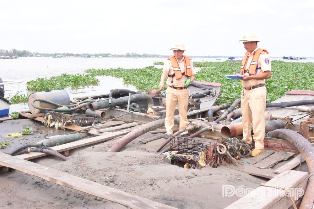 Tiếp đó, đêm 12-4, trong lúc tuần tra, kiểm soát, đảm bảo an toàn giao thông đường thủy và phòng, chống khai thác cát trái phép trên tuyến sông Tiền thuộc thủy phận phường Thới Sơn, Tổ công tác thuộc Đội Cảnh sát đường thủy số 02 phát hiện 2 ghe gỗ đang tàng trữ cát có dấu hiệu nghi vấn nên tiến hành kiểm tra. Khi thấy lực lượng Công an, 2 đối tượng điều khiển phương tiện đã nhảy xuống sông bỏ trốn. Lực lượng làm nhiệm vụ đã lập biên bản vụ việc, đồng thời lai dắt 2 phương tiện về để tạm giữ. Qua đo đạc, tổng số cát trên 2 phương tiện là 46 m³; cả 2 phương tiện đều có gắn thiết bị bơm, hút trái phép.