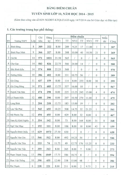 Sở Giáo dục- Đào tạo vừa công bố điểm chuẩn và chỉ tiêu tuyển sinh (năm học 2013-2014) vào các trường THPT trên toàn tỉnh. Theo đó, trường có điểm chuẩn trúng tuyển cao nhất là trường THPT Nguyễn Đình Chiểu (TP. Mỹ Tho): 27, 5 điểm.
