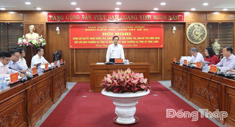 (BĐT) Sáng 4-3, tại trụ sở Tỉnh ủy Đồng Tháp, Đoàn kiểm tra, giám sát số 23 của Bộ Chính trị, Ban Bí thư Trung ương Đảng tổ chức Hội nghị công bố Quyết định kiểm tra, giám sát năm 2026 đối với Ban Thường vụ Tỉnh ủy Đồng Tháp và Ban Thường vụ Tỉnh ủy Vĩnh Long.