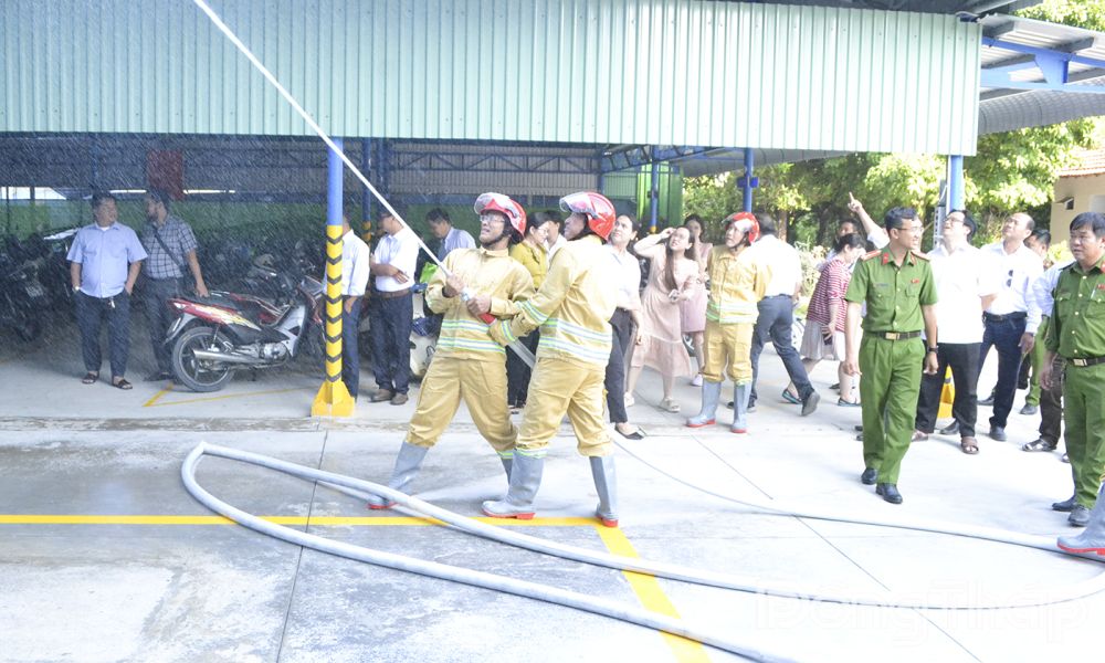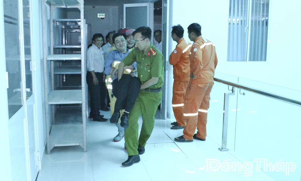Phần thực hành diễn ra với tình huống giả định cháy tại kho lưu trữ hồ sơ thuộc tầng 5 nhà điều hành mới. Ngay khi có tín hiệu báo cháy, lực lượng tại chỗ nhanh chóng triển khai các bước xử lý: Phát lệnh báo động, tổ chức chữa cháy ban đầu, cứu nạn người bị nạn và phối hợp nhịp nhàng với lực lượng chuyên nghiệp.