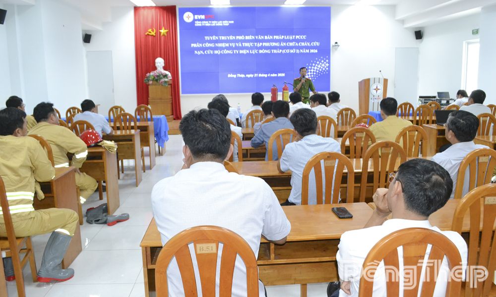 (ĐTO) Ngày 21-4, tại phường Mỹ Tho, Công ty Điện lực Đồng Tháp tổ chức tuyên truyền, phổ biến văn bản pháp luật phòng cháy, chữa cháy (PCCC), phân công nhiệm vụ và thực tập phương án chữa cháy, cứu nạn, cứu hộ (CNCH) năm 2026.