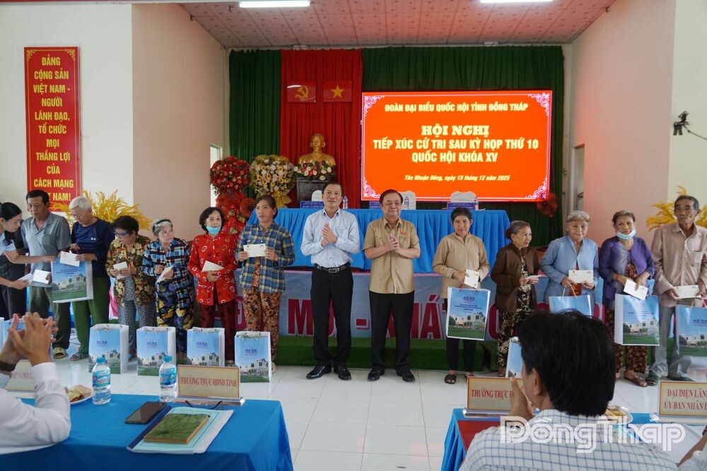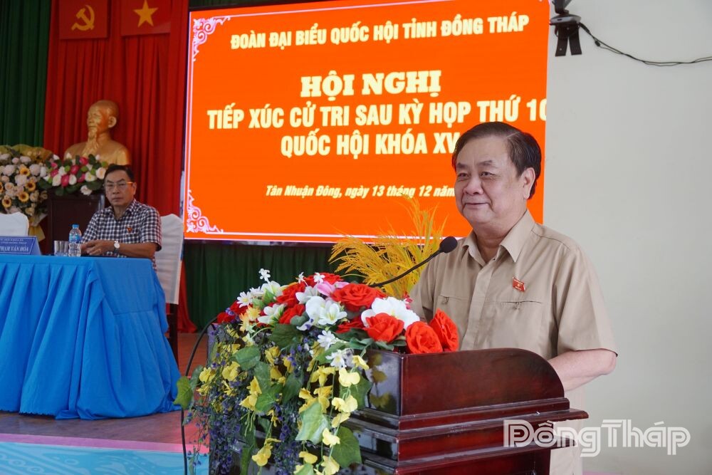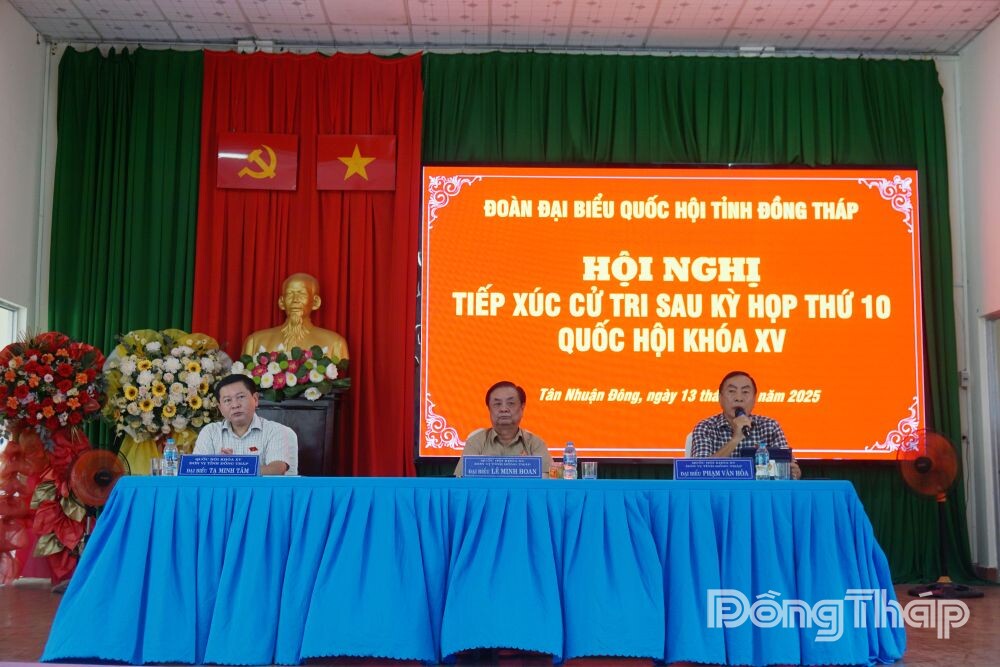 (ĐTO) Chiều 13-12, Đoàn đại biểu Quốc hội tỉnh Đồng Tháp (đơn vị số 3) gồm các đại biểu: Lê Minh Hoan, Ủy viên Ban Chấp hành Trung ương Đảng, Phó Chủ tịch Quốc hội; Tạ Minh Tâm, Phó Trưởng đoàn chuyên trách Đoàn Đại biểu Quốc hội tỉnh Đồng Tháp; Phạm Văn Hòa, Ủy viên Ủy ban Pháp luật của Quốc hội có buổi tiếp xúc cử tri xã Tân Nhuận Đông sau Kỳ họp thứ 10, Quốc hội khóa XV.